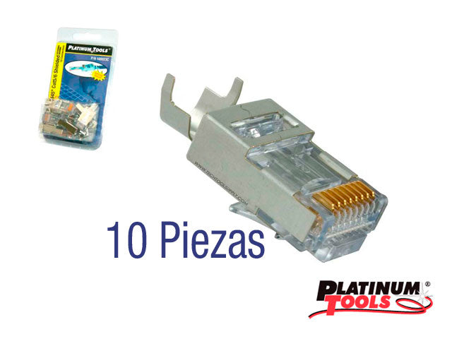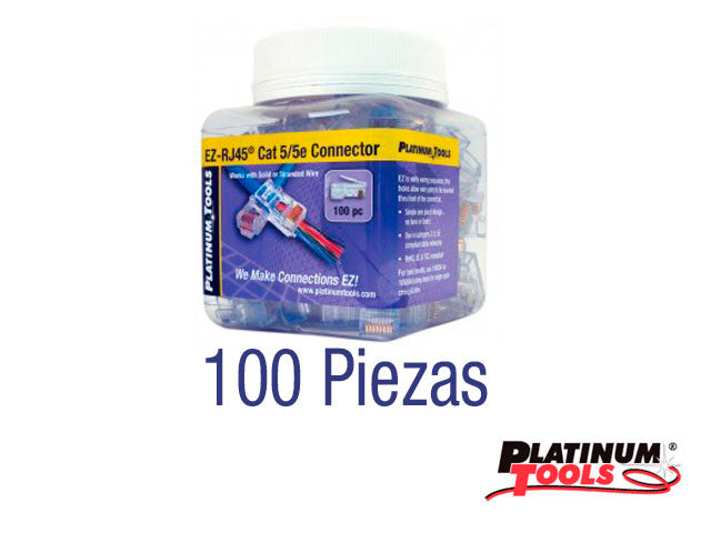 100003C PLATINUM TOOLS El conector patentado EZ-RJ45 100003C simplifica las terminaciones del cable UTP permitiendo que los cables insertados en el conector RJ45 sobre salgan en la punta del conector esto permite que el tecnico compruebe facilmente el orden de los pares del cableado. A traves de los agujeros permiten que los pares de hilos se inserten a traves de la parte frontal del conector para las terminaciones mas rapidas. Funciona con cable solido o trenzado. Diseñado simple de una sola pieza no hay revestimientos. FCC UL clasificado. Compatible con cable de la categoria 5, 5E.