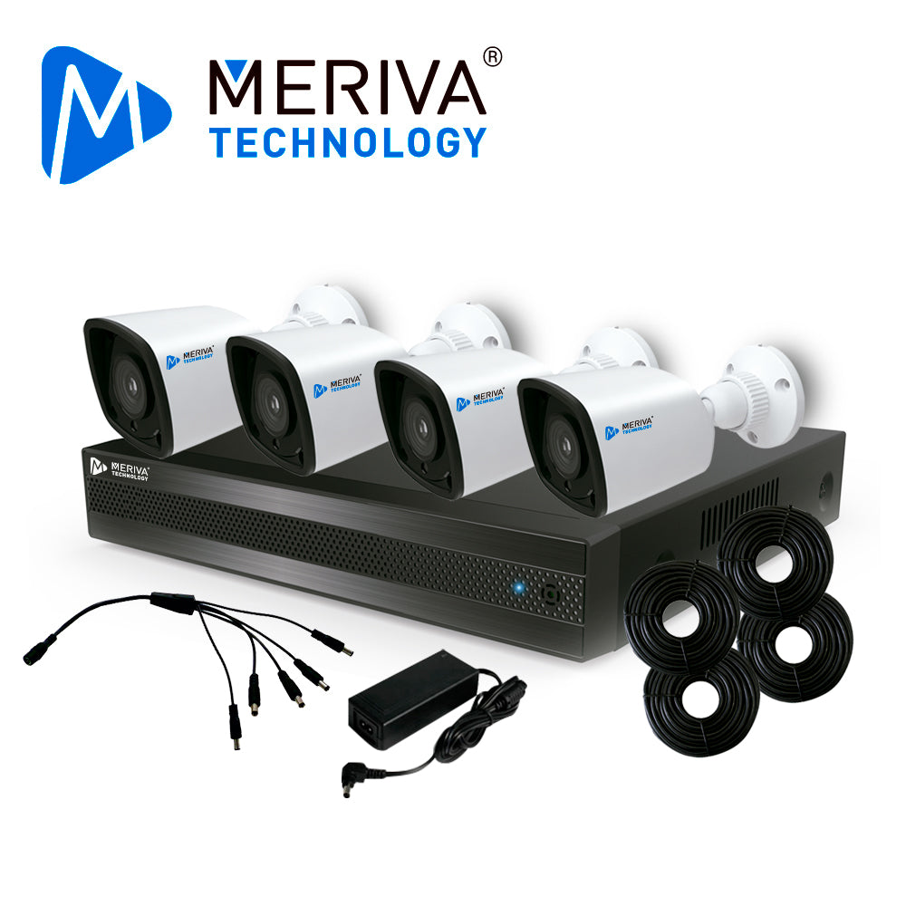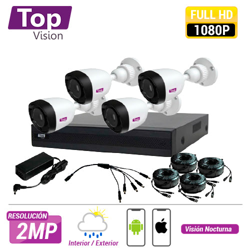 TOPVISION - KITS - TOP2505El KIT de videovigilancia TOP2504 contiene todo lo necesario para una instalación profesional. El sistema permite grabar a una resolución de alta definición a 5MP / 4MP / 1080P / 1080PLite / 720P / WD1, audio bidireccional, control para cámaras PTZ por protocolo CoC y puerto RS485, conexión a internet por P2P, salida de video HDMI Full HD y códec de compresión H.265, también es compatible con el software NVMS1000 de Meriva incluye cables pre ponchados, fuente y cámaras.